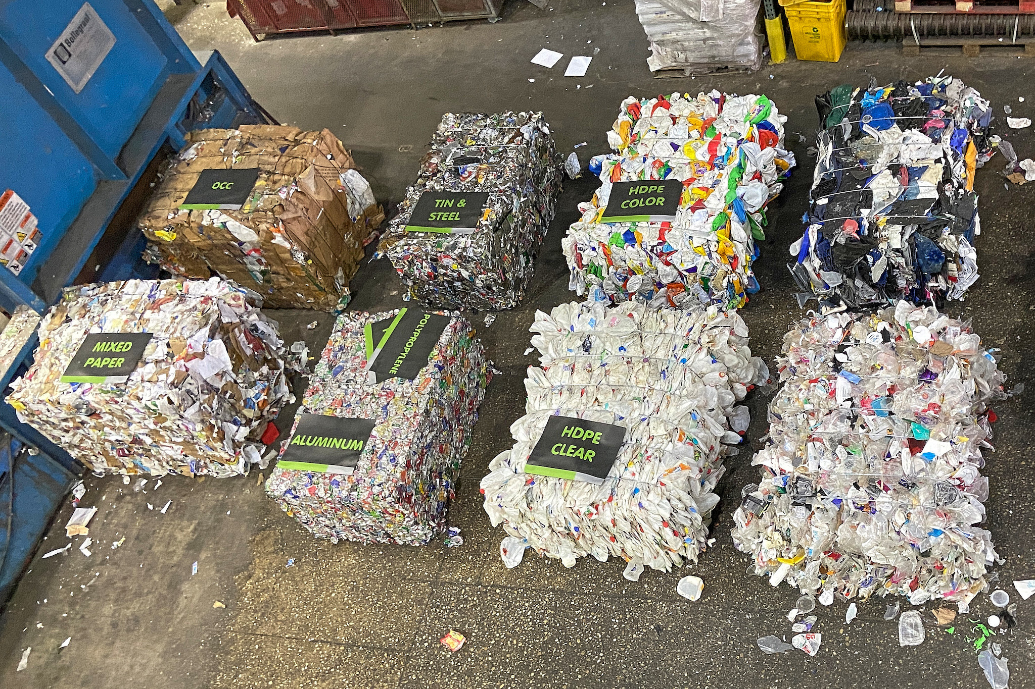 Early in the process, the materials run through a system that uses air and rotating rollers with gears to push lighter materials like paper and cardboard up, like popcorn, over and off to a different conveyor, while bulky and heavier items like cans and bottles fall through the rollers to another part of the system. The cardboard and paper are separated and dropped into giant bins called bunkers. Once the right amount by weight is met, the material is pressed into large rectangular bales, wrapped with wire and moved to storage awaiting sale at the end of the month.